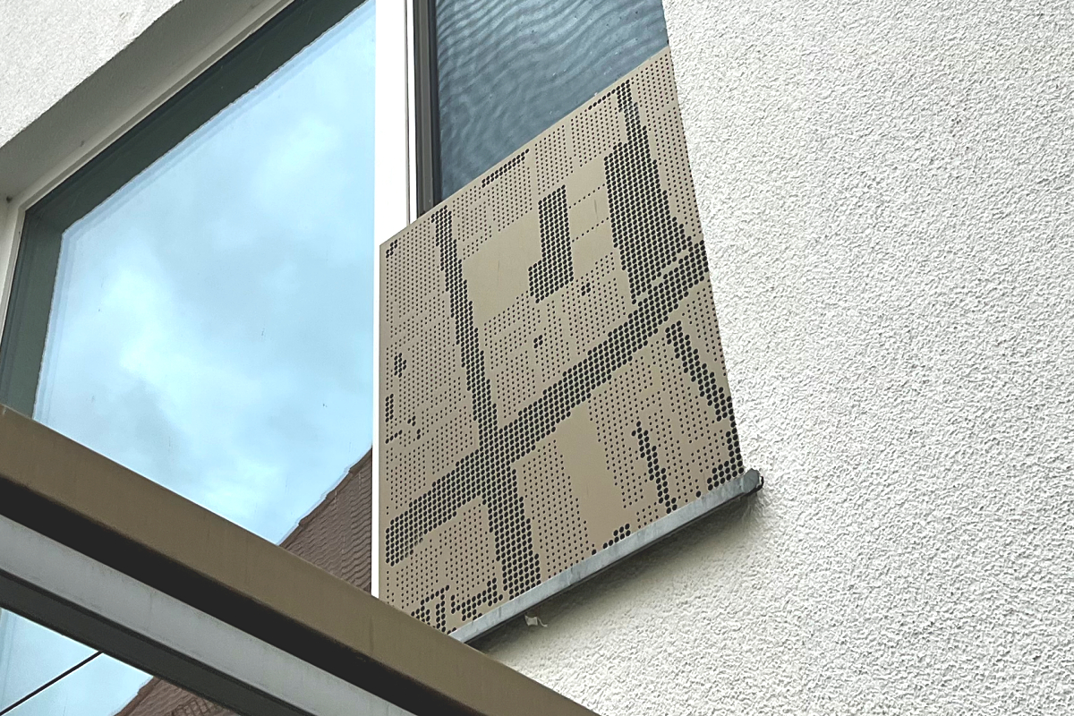 Die Fotobleche bieten straßenseitigen Sicht- schutz und hofseitige Geländer, die so blickdicht sind, dass zusätzlicher Sichtschutz unnötig wird.